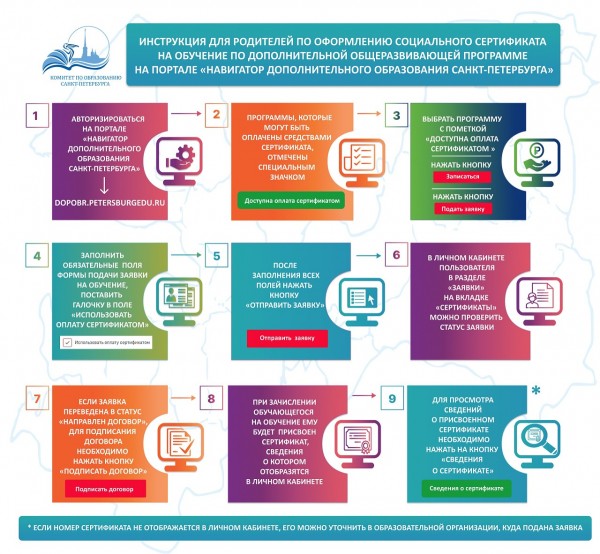 Подача заявки на получение сертификата происходит автоматически при подаче заявки на программу на сайте Навигатора дополнительного образования (https://dopobr.petersburgedu.ru/).